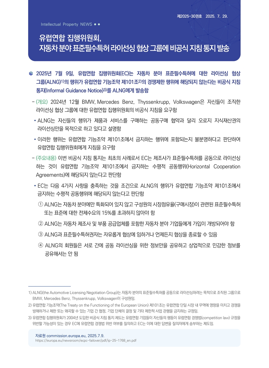 | 유럽연합 집행위원회,자동차 분야 표준필수특허 라이선싱 협상 그룹에 비공식 지침 통지 발송 |