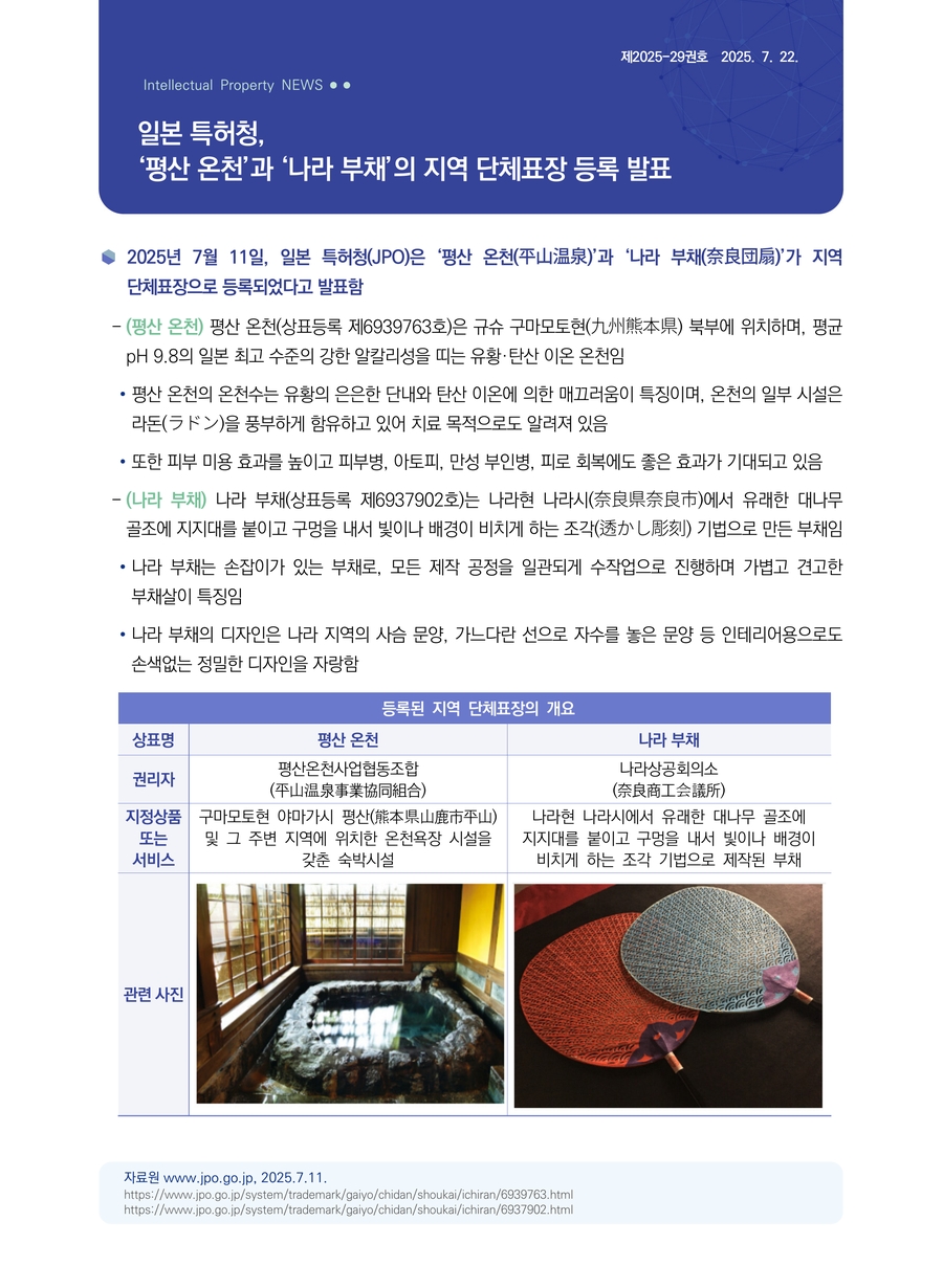 | 일본 특허청, ‘평산 온천’과 ‘나라 부채’의 지역 단체표장 등록 발표 |