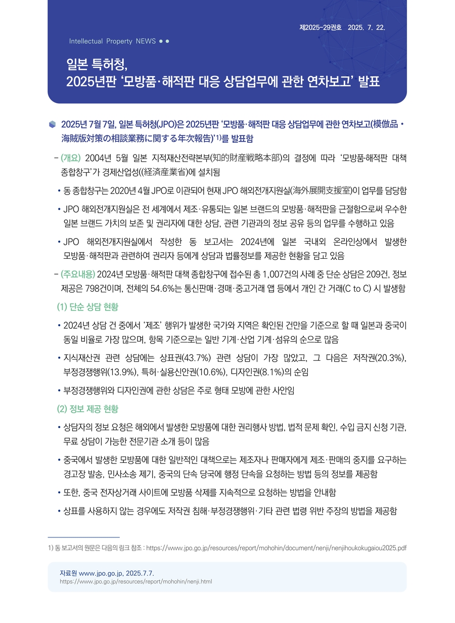 | 일본 특허청, 2025년판 ‘모방품․․해적판 대응 상담업무에 관한 연차보고’ 발표 |