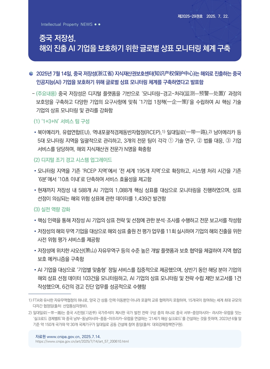 | 중국 저장성, 해외 진출 AI 기업을 보호하기 위한 글로벌 상표 모니터링 체계 구축 |