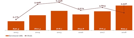 - (주요내용) 동 보고서의 결과에 따르면, 2018년 미국의 벤처 투자를 받은 기업은 30% 증가하였고 벤처 투자 금액은 2017년보다 증가하였으나 벤처 투자 건수는 감소하였으며, 주요내용은 다음과 같음 ∙ (전체규모) 벤처캐피탈 투자 금액은 2018년에 약 995억 달러를 기록하여 역대 가장 높은 금액을 투자하였으나, 거래 건수는 2013년 이래로 가장 낮은 건수를 기록하며 메가라운드2) 거래가 많이 행해진 것으로 분석됨