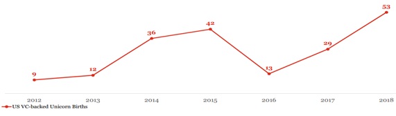 ∙ (신규 유니콘) 미국 벤처캐피탈을 투자받은 신규 유니콘3) 개수는 2018년 53개 기업이며, 2017년 29개보다 83% 증가하였으며, 2012년 이래로 가장 높은 수치를 기록함