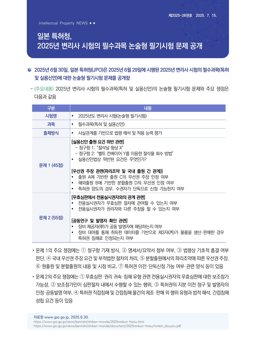 | 일본 특허청, 2025년 변리사 시험의 필기시험(필수과목) 문제 공개 |