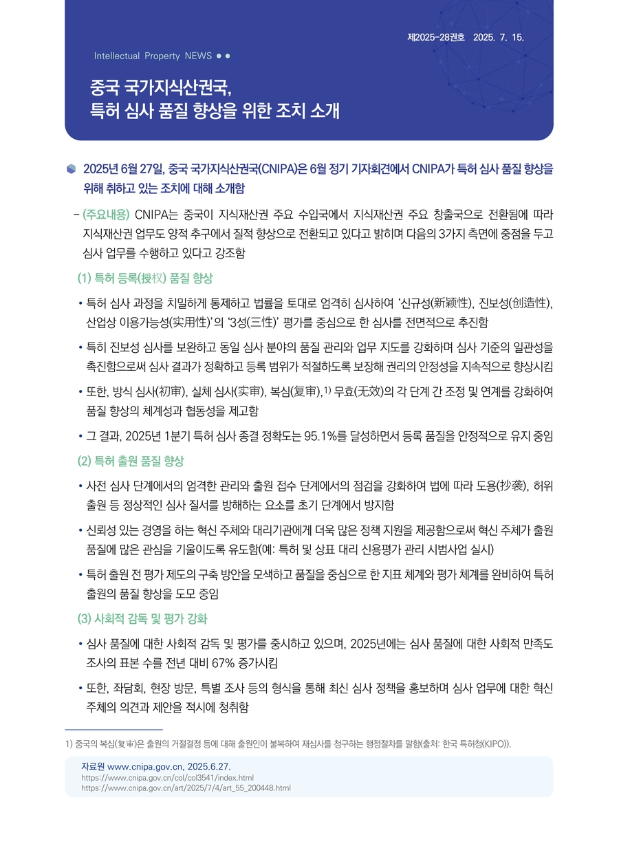 | 중국 국가지식산권국, 특허 심사 품질 향상을 위한 조치 소개 |