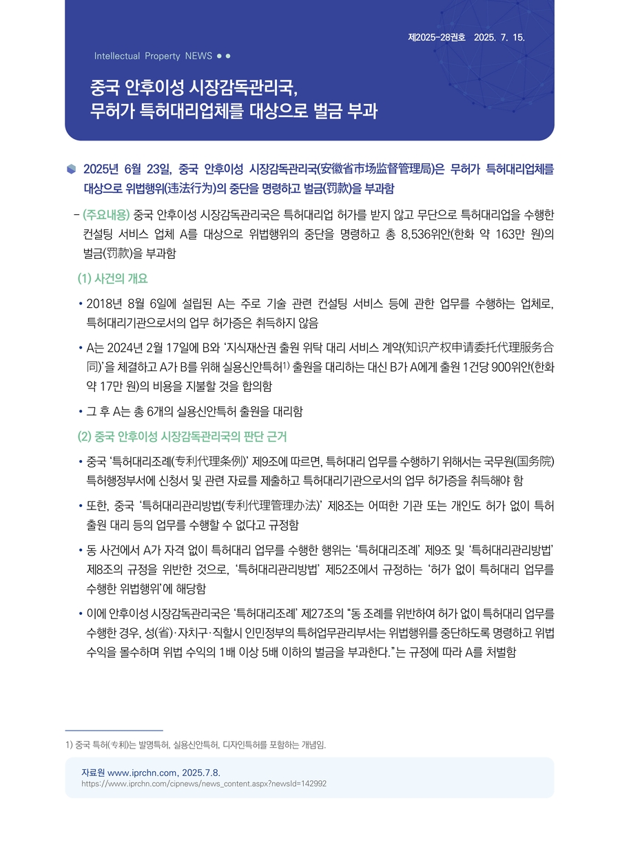 | 중국 안후이성 시장감독관리국, 무허가 특허대리업체를 대상으로 벌금 부과 |