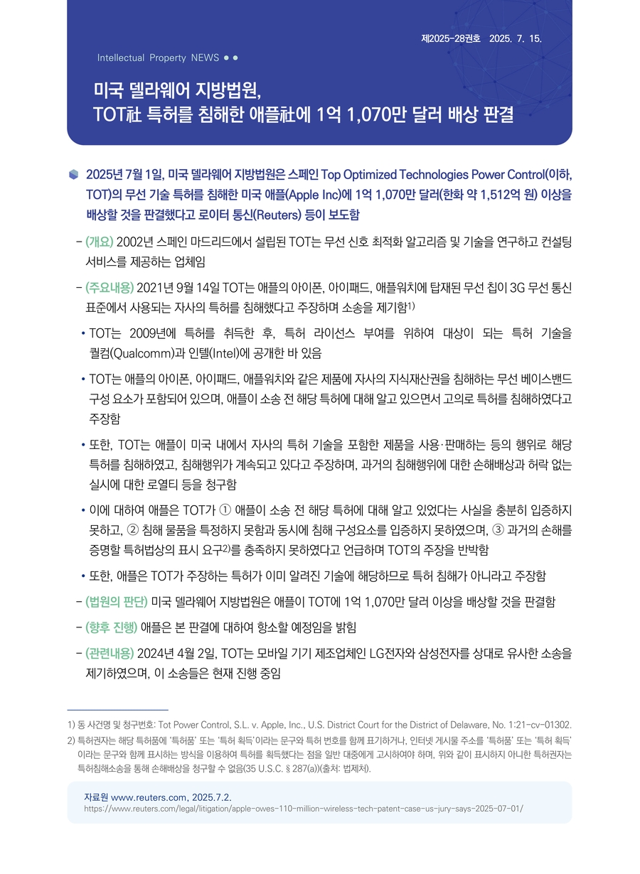 | 미국 델라웨어 지방법원, TOT 특허 기술을 침해한 미국 애플 社에 1억 1,070만 달러 배상 판결 |