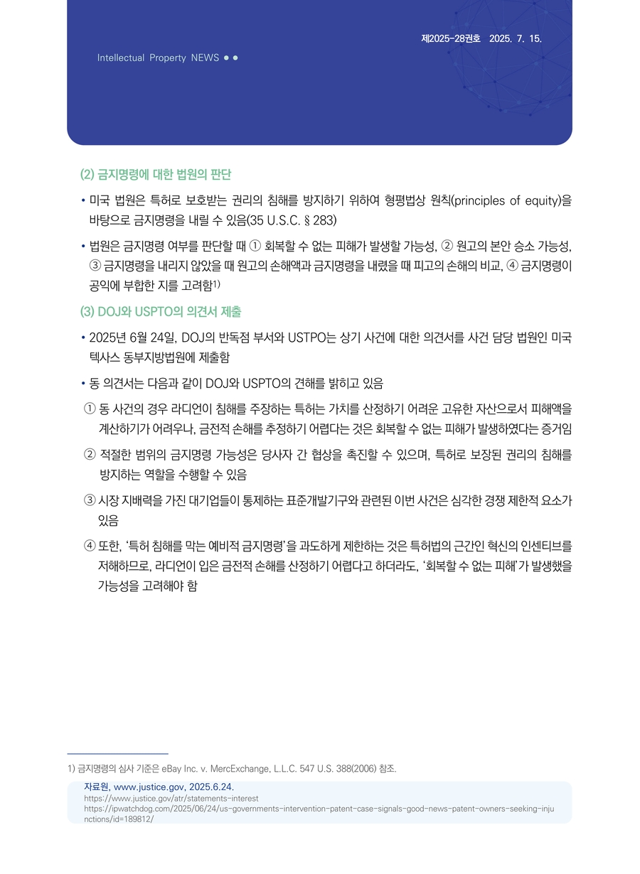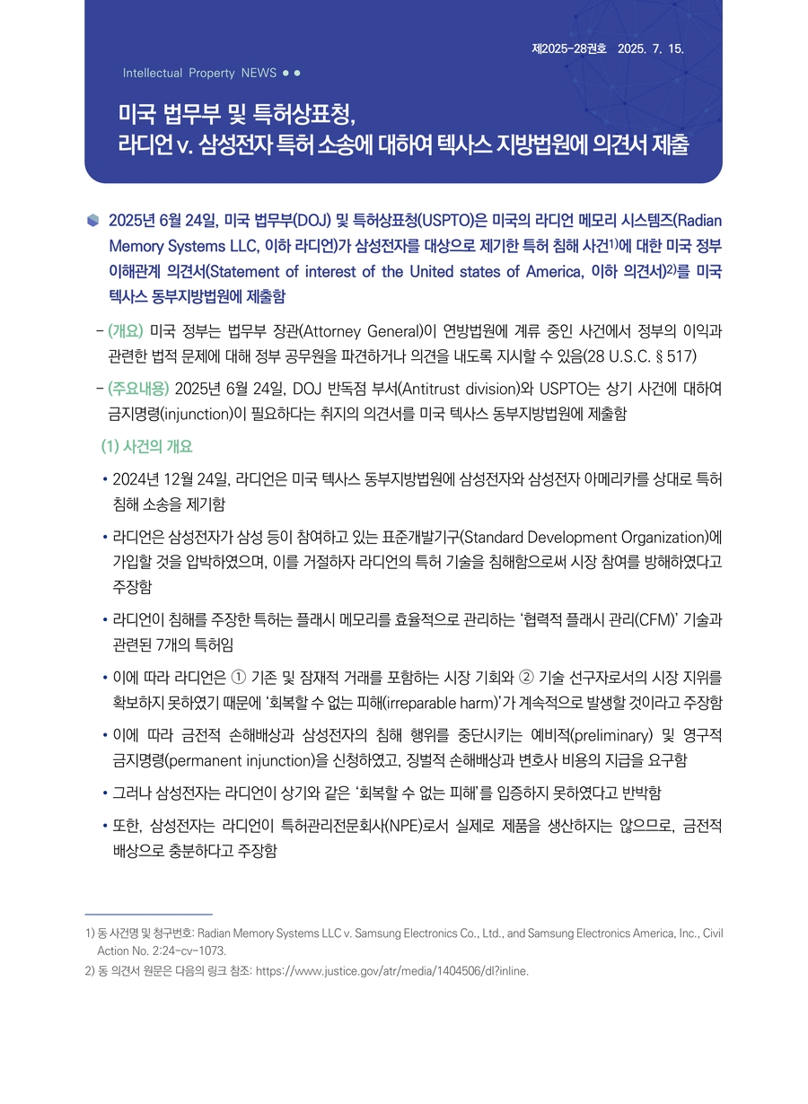 | 미국 법무부 및 특허상표청, 라디언 v. 삼성전자 특허 소송에 대하여 텍사스 지방법원에 의견서 제출 |