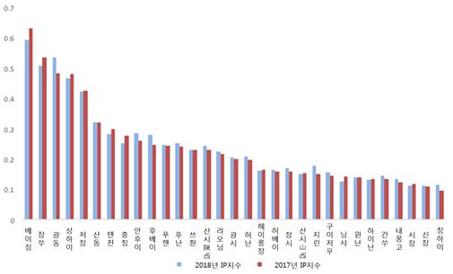 - (배경) 동 보고서는 올해로 10년째 편찬되는 것으로 장기간 동안 축적된 빅데이터를 바탕으로 연구를 수행하여 중국 각 지역의 지식재산권 발전수준 및 품질에 대한 분석결과를 제공함 - (주요내용) 동 보고서가 도출한 2018년도 중국 지역별 지식재산권 발전의 주요 특징은 다음과 같음 ∙ 2018년 지식재산권지수 상위 10위 지역은 베이징, 광동, 장쑤, 상하이, 저장, 산동, 안후이, 톈진, 후베이, 충칭이 기록하였으며, 베이징이 9년 연속 전국 1위를 기록함 ∙ 전년과 비교했을 때 상위 10개 지역과 나머지 지역 간의 격차가 여전히 뚜렷하였으며, 반면 상위 10개 지역 간의 격차는 다소 축소됨 ∙ 특허품질지수 상위 10개 지역은 광동, 베이징, 저장, 장쑤, 상하이, 산동, 푸젠, 톈진, 후베이, 후남 순이었으며 하위 10개 지역은 윈난, 지린, 헤이롱장, 내몽고, 하이난, 간쑤, 시장티벳자치구, 칭하이, 닝샤후이족자치구, 광시장족자치구가 기록하여 동부지역이 높고 중서부 지역이 낮은 양상을 보임 ∙ 지식재산권 종합실력 향상지수 상위 10개 지역인 장시, 윈난, 푸젠, 시장티벳자치구, 허베이, 쓰촨, 지린, 구이저우, 허난, 후난은 대부분이 중서부 지역으로 중서부 지역의 성장세가 두드러짐 ∙ 특허 및 상표 규모지수와 해당 지역경제 발전수준 간에 관련성이 높은 것으로 나타났는데, 경제 발전수준이 높은 지역은 기업과 상품이 많아 특허 및 상표 또한 많이 보유하였으며, 이러한 지역은 시장경쟁력도 강하여 브랜드인식과 지식재산권 보호인식도 높았음