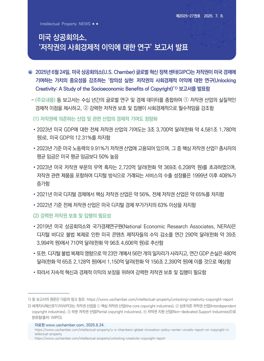 | 미국 상공회의소, ‘저작권의 사회경제적 이익에 대한 연구’ 보고서 발표 |
