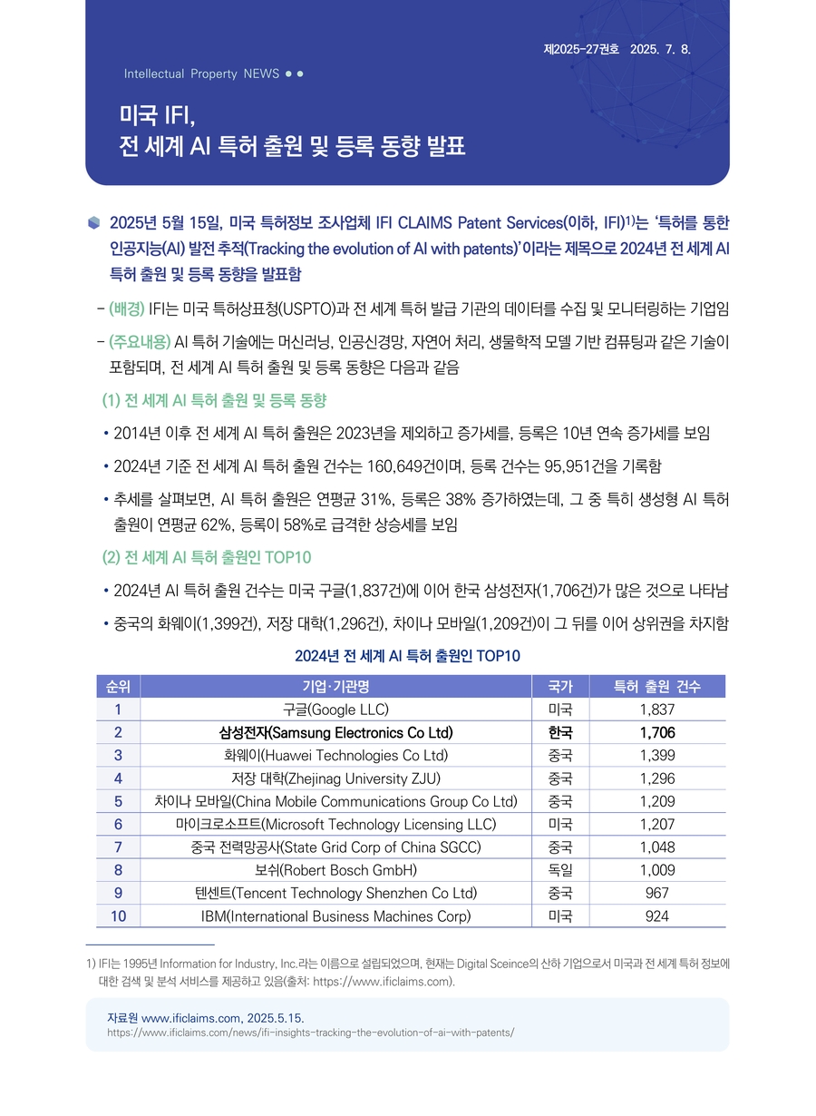 | 미국 IFI, 전 세계 AI 특허 출원 및 등록 동향 발표 |