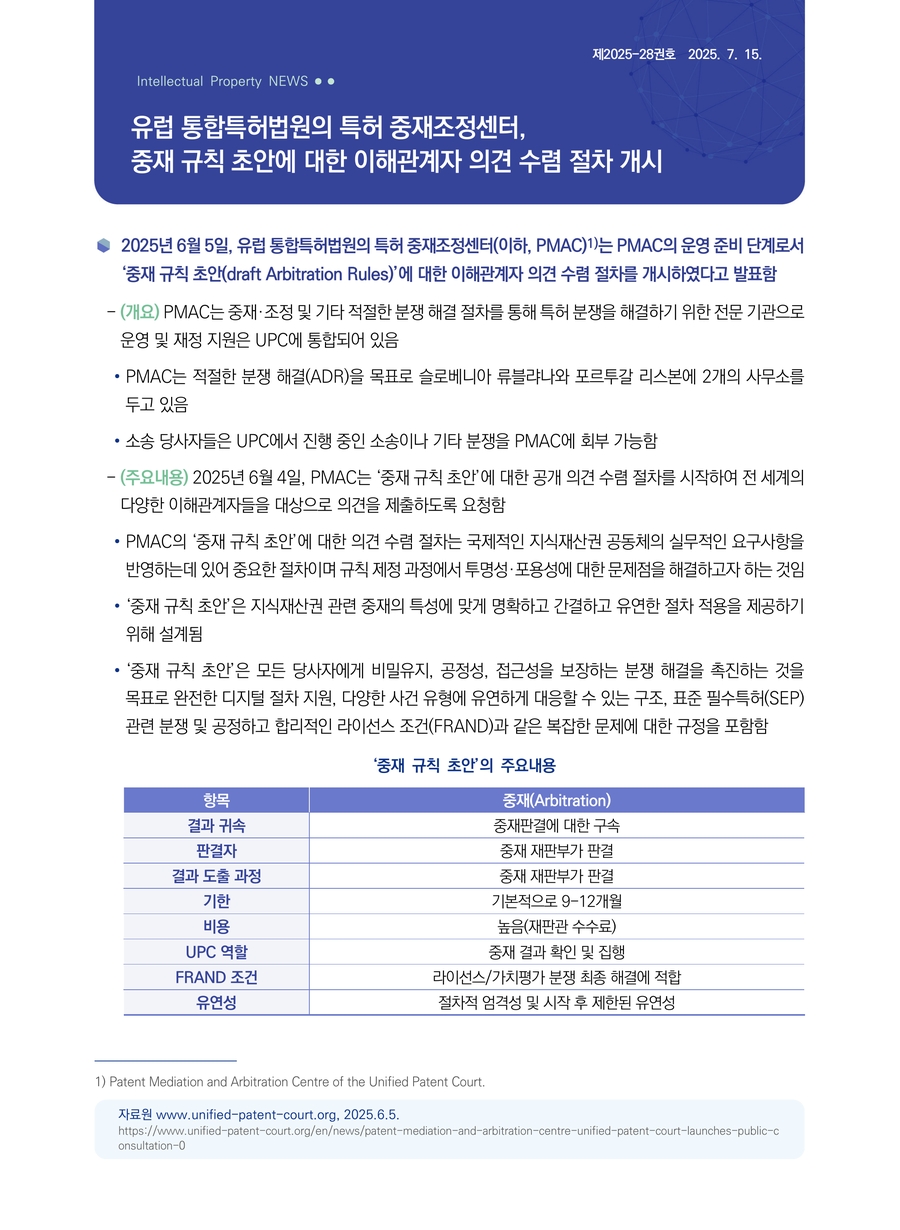 | 유럽 통합특허법원의 특허 중재조정센터, 중재 규칙 초안에 대한 이해관계자 의견 수렴 절차 개시 |