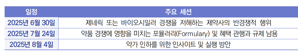 ∙ 2025년 6월 11일, 미국 연방거래위원회(FTC)와 법무부 반독점국(DOJ Antitrust Division)은 미국 상무부(DOC), 보건복지부(HHS)와 협력하여 처방약(prescription drug)에 대한 약가 인하를 위해 시장 경쟁을 촉진하는 방안 등을 논의하는 공청회(listening sessions)를 개최할 예정이라고 발표함