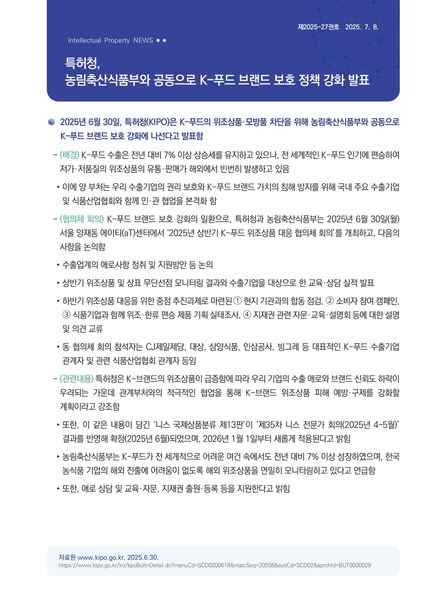 | 특허청, 농림축산식품부와 공동으로 K-푸드 브랜드 보호 정책 강화 발표 |