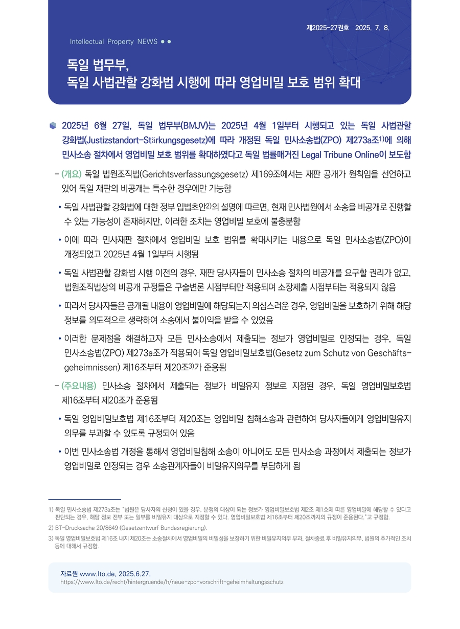 | 독일 법무부, 독일 사법관할 강화법 시행에 따라 영업비밀 보호 범위 확대 |
