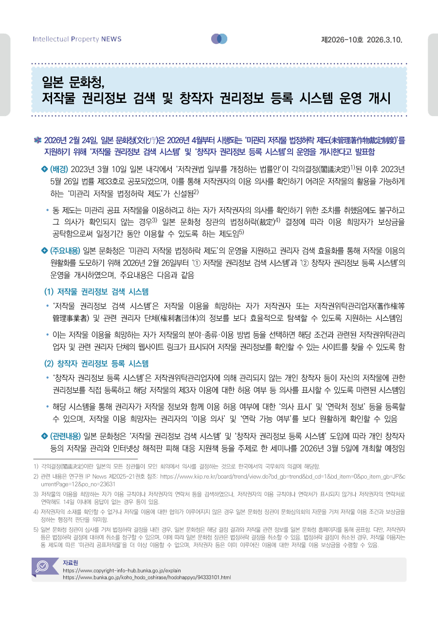 일본 문화청, 저작물 권리정보 검색 및 창작자 권리정보 등록 시스템 운영 개시