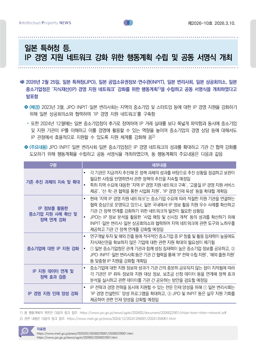 일본 특허청 등, IP 경영 지원 네트워크 강화 위한 행동계획 수립 및 공동 서명식 개최