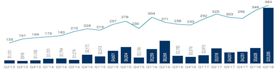 - (개요) 동 조사는 글로벌 핀테크 기술투자(레그테크(Regtech)1), 보험, 블록체인, 지불방법 등) 현황, M&A, 벤처캐피탈 현황, 기업활동을 중심으로 하여 분기별 현황에 대하여 조사하였음 - (주요내용) 2013년 이래로 핀테크 관련 벤처캐피탈 투자 건수는 매년 증가하였고, 2018년에는 1,476건을 기록할 것으로 예상되며, 주요내용은 다음과 같음 ∙ 2018년 2/4분기 핀테크 관련 벤처캐피탈 투자액은 2018년 1/4분기 56.3억 달러(349건)에 비하여 약 3.6배 증가한 203.4억 달러(383건)가 이루어졌으며, 이는 역대 최고 투자수치임 ∙ 2018년 2/4분기에 탄생한 핀테크 유니콘2)은 미국의 P2P 기술업체인 Circle社, 미국의 비즈니스 커머스 플랫폼인 Tradeshift社, 미국의 소셜미디어 분석업체인 Dataminr社, 영국의 모바일뱅킹 스타트업인 Revolut社, 인도의 보험관련 플랫폼인 PolicyBazaar社와 같이 5개임 ∙ 대륙별로, 북아메리카는 158건의 거래로 1위를 차지하였으며, 아시아는 133건의 거래로 2위, 다음으로 유럽(72건), 아프리카(7건) 순임 ∙ 2018년 2/4분기 핀테크 스타트업은 중소기업의 대출과 관련된 내용을 주로 다루었으며, 대표기업으로 미국의 Tradeshift社, 미국의 Brex社, 미국의 Divvy社가 이에 해당됨 ∙ 전체 보험기술(insurtech)에 대한 투자는 2018년 1/4분기(6.62억 달러, 43건)에 비하여 감소한 4.68억 달러(37건)를 기록하였으나, 유럽은 초기단계의 보험기술 거래(8건, 1.92억 달러)가 활발히 이루어졌음 ∙ 2018년 2/4분기 ICO3)는 1/4분기(464건)에 비하여 1.9배 감소한 245건을 기록하였으며, 핀테크 기술업체와 가상화폐업체와의 M&A는 3건을 기록함