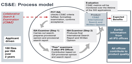 - (배경) 동 프로그램은 2018년 6월 14일 제11회 IP5 청장회의에서 나온 의견으로, PCT 국제특허출원에 대한 협력심사를 7월 1일부터 시작하기로 합의함 ∙ CS&E는 PCT 출원에 대해 모든 IP5 특허청 심사관들이 협업을 통해 PCT 국제조사보고서(International Search Report) 및 의견서(Written Opinion) 작성을 하는 것임 - (주요내용) 동 프로그램은 PCT 출원인이 국제조사기관(International Search Authorities, ISA)을 선택하여 ISA로부터 국제조사보고서 및 의견서를 받는다는 점은 종전과 동일하지만 내부절차 상 차이를 보이며, 주요내용은 다음과 같음 ∙ ISA에 속한 심사관(main examiner)이 조사 및 심사 작업 후 예비 국제조사보고서 및 의견서를 작성 후 이를 ISA가 아닌 다른 나머지 IP5 특허청에 전달함 ∙ 다른 IP5 특허청에 속한 심사관들(peer examiners)이 예비 국제조사보고서 및 의견서를 검토 후 자신의 독자적인 심사 결과물을 더하여 피드백을 줌 ∙ ISA의 심사관이 이를 참조하여 최종 국제조사보고서 및 의견서를 작성하게 되며, 최종 국제조사보고서 및 의견서만이 특허심사하이웨이(PPH)1) 참여를 결정하는 근거가 됨 ∙ 최종 결과물과는 별도로 peer examiners의 의견은 WIPO PatentScope에서 열람가능함 ∙ 파일럿 프로그램의 참여는 WIPO 홈페이지에 게시된 신청서 양식2)을 작성하여 제출하면 되고, 동 양식은 중국어, 프랑스어, 독일어로도 제공하고 있음