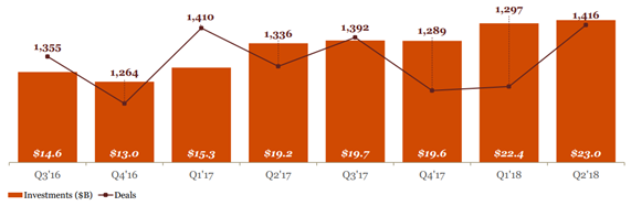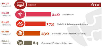 ∙ (분야) 2018년 2/4분기에 인터넷 분야는 610건의 벤처캐피탈 투자와 89억 달러의 투자액으로 가장 벤처캐피탈 투자가 활발한 분야로 기록되었고 다음으로 헬스케어(216건, 53억 달러), 모바일 및 통신(173건, 34억 달러) 순임