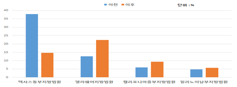 - (주요내용) 2018년 상반기 특허소송은 2017년 상반기(2,956건)에 비하여 약 15% 감소한 2,501건을 기록하였으며, 주요내용은 다음과 같음 ∙ 지방법원의 특허 소송 건수는 1,684건으로 전년도 상반기(1914건) 대비 약 12% 감소하였고, 미국 특허심판원(PTAB)에 접수된 특허무효심판은 797건으로 전년도 상반기(987건) 대비 약 19% 감소함