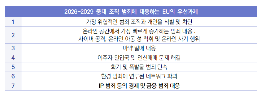 ∙ 2025년 6월 13일, 유럽연합 이사회(EU Council)는 유럽을 위협하는 10대 범죄로 지식재산 범죄(IP Crime) 등을 포함하는 ‘2026-2029 중대 조직 범죄에 대응하는 유럽연합(EU)의 우선과제(2026-2029 EU priorities for the fight against serious and organised crime)’를 발표함