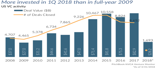 • 2018년 6월 11일, 미국 특허관련 콘텐츠 제공 매체 PatentDocs는 벤처캐피탈협회(National Venture Capital Association, NVCA)가 작성한 2018년 1/4분기 벤처자금 보고서의 결과를 발표함