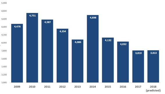- (개요) 동 분석은 미국 지식재산 소송 전문 분석기관인 Lex Machina社의 데이터를 통하여 분석하였으며, 2009년부터 2018년까지의 소송건수, 소송이 제기된 지역, 주요 로펌에 대해 발표함 - (주요내용) 동 분석의 주요내용은 다음과 같음 ∙ 미국의 상표권 소송건수는 2015년(4,132건) 이래로 지속적으로 감소하였으며, 2016년 4,032건, 2017년 3,810건을 기록하였고, 2018년에는 3,813건이 예측됨 ∙ 2009년부터 2018년까지 상표권 소송이 가장 많이 제기된 지역은 캘리포니아 중부지역이었고, 다음으로 일리노이 북부지역, 뉴욕 남부지역, 플로리다 남부지역, 캘리포니아 북부지역 순임 ∙ 또한 상표권 소송에서 원고의 사건을 가장 많이 담당한 로펌은 Greer, Burns & Crain 로펌이고, 피고의 사건을 가장 많이 담당한 로펌은 Greenberg Traurig 로펌임