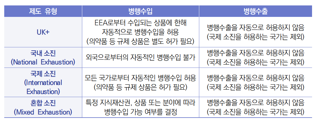 - (배경) 유럽연합(EU)은 ‘유럽경제지역(EEA) 역내 소진(Regional Exhaustion) 제도’를 채택하고 있는 바, EU 회원국에서 최초로 출시된 상품에 대한 지식재산권이 다른 회원국 내에서는 소진된 것으로 간주되어 회원국 간에는 권리자의 허가 없이 병행수입이 허용되고, 역외 국가로부터의 병행수입은 각국의 입법례에 따라 결정함 ∙ 영국은 브렉시트(Brexit)로 2021년 1월 1일부터 EU의 ‘EEA 역내 소진 제도’가 적용되지 않게 되었으나, EU 탈퇴에 관한 국내법의 적용에 따라 영국이 ‘EEA 역내 소진 제도’에 일방적으로 참여하는 이른바 ‘UK+ 제도’를 시행함 ∙ 2021년 6월, 영국 정부는 지식재산권 소진 제도를 구현하는 4가지 선택지를 이하와 같이 제시하면서 향후 영국 정부가 나아갈 방향에 대해 관련 이해관계자의 의견을 요청하고 공개 협의를 개시함 ![]() - (주요내용) 영국 정부는 공개 협의에 대한 응답 요약 및 정부 답변을 공개하고 현행의 ‘UK+ 제도’를 유지하기로 하였음을 최종 확인하며 다음과 같이 언급함 ∙ ‘UK+ 제도’ 유지 결정은 지식재산권 보호를 받는 상품이 영국 또는 EEA에서 합법적으로 판매된 경우, 해당 상품의 지식재산권 권리자는 이후 영국에서 해당 상품이 재판매되는 것을 금지할 수 없다는 것을 의미함 ∙ 동 결정은 추가적인 법률 제정 또는 변경이 필요하지 않음을 확정하는 것으로 법적 명확성을 제공함으로써 병행무역을 수행하는 기업과 관련 상품에 접근하는 소비자에게 확실성과 안정성을 부여함 ∙ 예를 들어, 기업은 별도 추가 절차 없이 EEA 공급업체로부터 정품을 구매해 영국에서 판매할 때 지식재산권 권리자의 허가를 받지 않아도 되고, 소비자들은 이러한 상품에 지속적으로 쉽게 접근할 수 있게 됨 |