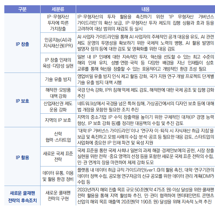 - (주요내용) 동 계획은 지식재산(IP) 트랜스포메이션을 부제로 하여 IP 전략의 중점 시책을 4가지 부문 ① IP 창출, ② IP 보호, ③ IP 활용, ④ 새로운 쿨재팬 전략2)의 후속 조치로 나누어 제시함 ![]() 1) 동 계획의 원문 링크는 다음을 참조: https://www.kantei.go.jp/jp/singi/titeki2/chitekizaisan2025/pdf/suishinkeikaku.pdf 2) 일본의 문화 등을 사업화하여 해외 수출하는 것을 지원하는 경제문화정책을 말함(출처: 일본 내각부 지식재산전략본부).