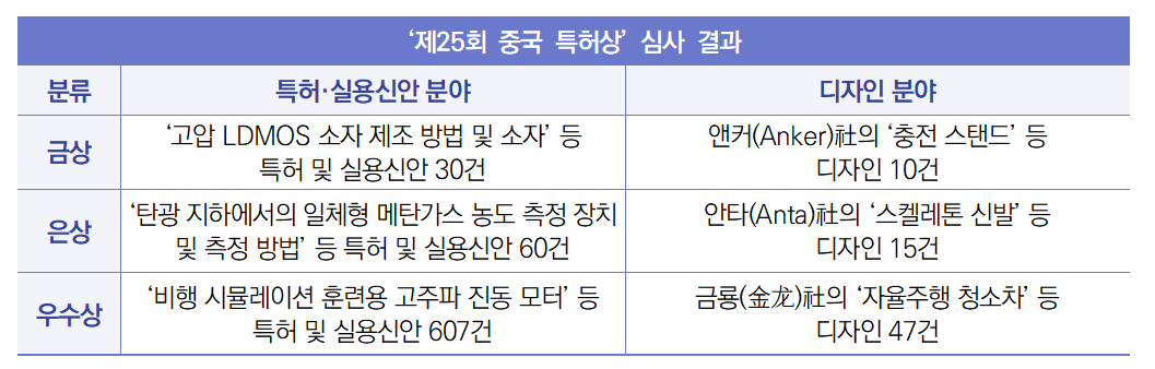 ∙ 2025년 6월 5일, 중국 국가지식산권국(CNIPA)은 ‘제25회 중국 특허상(第二十五届中国专利奖)’의 심사 결과를 발표함