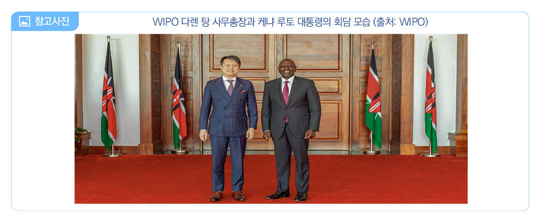 - (주요내용) WIPO 다렌 탕 사무총장은 케냐의 혁신 및 창의 생태계를 지원하고 국가 주요 이해관계자들과의 협력을 강화하기 위해 케냐를 방문하여 다음과 같은 행사에 참석함 ∙ 케냐 루토(Ruto) 대통령과 회담하여 WIPO와의 협력 강화를 위한 방안에 대해 논의함 ∙ 케냐 외교부(Foreign Affairs) 코리르 싱오에이(Korir Sing’oei) 수석 비서관과 국제 지식재산(IP) 협력에 대해 논의함 ∙ 케냐 국가혁신청(Kenya National Innovation Agency)이 주최한 케냐 스타트업 페스티벌(Kenya Startup Festival) 기조연설에서 IP가 지역 혁신가들이 아이디어를 확장하고 투자 유치 및 지역·글로벌 시장으로 진출하는데 있어 게임 체인저(game-changer)가 될 수 있음을 강조함 ∙ 케냐 위조방지당국(ACA), 케냐 저작권위원회(Kenya Copyright Board), 케냐 산업연구개발청(KIRDI) 등 주요 IP 기관의 기관장들과 만나 IP 정책의 부문 간 협력 강화에 대해 논의함 ∙ 세계 위조 방지의 날(World Anti-Counterfeit Day) 기념식에서 기조연설을 하며 케냐의 법 집행 및 인식 제고의 진전을 높이 평가하고, 케냐 위조방지당국이 발간한 연구보고서 2건을 환영함 ∙ 케냐 나이로비대학교(University of Nairobi)의 교수진과 ‘사회 및 경제 발전에서의 연구와 IP(Research and Intellectual Property in Social and Economic Development)’라는 주제로 IP가 연구, 상용화 및 국가 발전에 있어 수행하는 역할에 대해 의견을 교환함