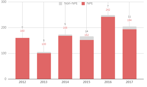 - (주요내용) 2017년 Cloud 기술에 대한 소송현황의 주요내용은 다음과 같음 ∙ Cloud 기술 소송은 2016년에 249건을 기록하였지만, 2017년에는 17.7% 감소한 205건을 기록함 ∙ 2017년 전체 Cloud 기술 소송 205건 중 비실시기업(NPE)이 194건을 제기하여 NPE가 전체 소송의 92%이상을 차지하고 있음 ∙ 2017년 Cloud 기술 중에서 가장 많은 소송비율을 차지한 기술은 액세스(33.7%)이고, 그 다음으로 저장 및 동기화(26.8%), 데이터시스템(22.0%), 호스팅 및 공유(17.6%) 순임 ∙ 2017년 NPE와 소송을 가장 많이 한 기업은 Uniloc USA社(32건)이고, 그 다음으로 Realtime Data社(30건), Guyzar社(22건), Realtime Adaptive Streaming社(11건), University of Tennessee Research Foundation(11건) 순임