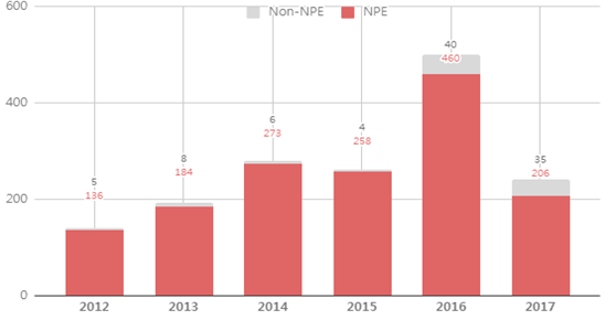 - (주요내용) 2017년 IoT 기술에 대한 소송현황의 주요내용은 다음과 같음 ∙ IoT 기술 소송은 2016년에 큰 폭(90.8%)으로 증가한 500건을 기록하였지만, 2017년에는 51.8% 감소하여 과거와 비슷한 수준(241건)으로 복귀하였음 ∙ 2017년 전체 IoT 기술 소송 241건 중 비실시기업(NPE)이 206건을 제기하여 특허비실시기관(Non Practicing Entity, NPE)가 전체 소송의 85%이상을 차지하고 있음 ∙ 2017년 IoT 기술 중에서 가장 많은 소송비율을 차지한 기술은 통신 프로토콜 및 네트워킹(44.8%)이고, 그 다음으로 통신장비(25.7%), IP통신(22.4%), 웨어러블 디바이스(5.8%), 보안장치(1.2%) 순임 ∙ 2012년부터 2017년까지 NPE와 소송을 가장 많이 한 기업은 Pragmatus Telecom社(82건)이고, 다음으로 Penovia社(71건), Innovative Wireless Solutions社(66건), Olivistar社(63건), Rothschild Connected Devices Innovations社(60건) 순임