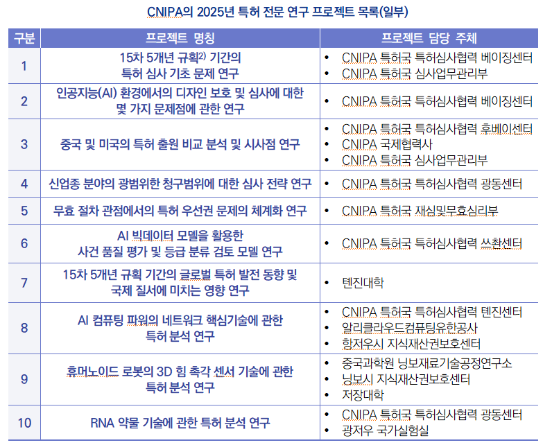 ∙ 2025년 5월 20일, 중국 국가지식산권국(CNIPA)은 2025년 특허 전문 연구 프로젝트 목록을 선정 및 발표함