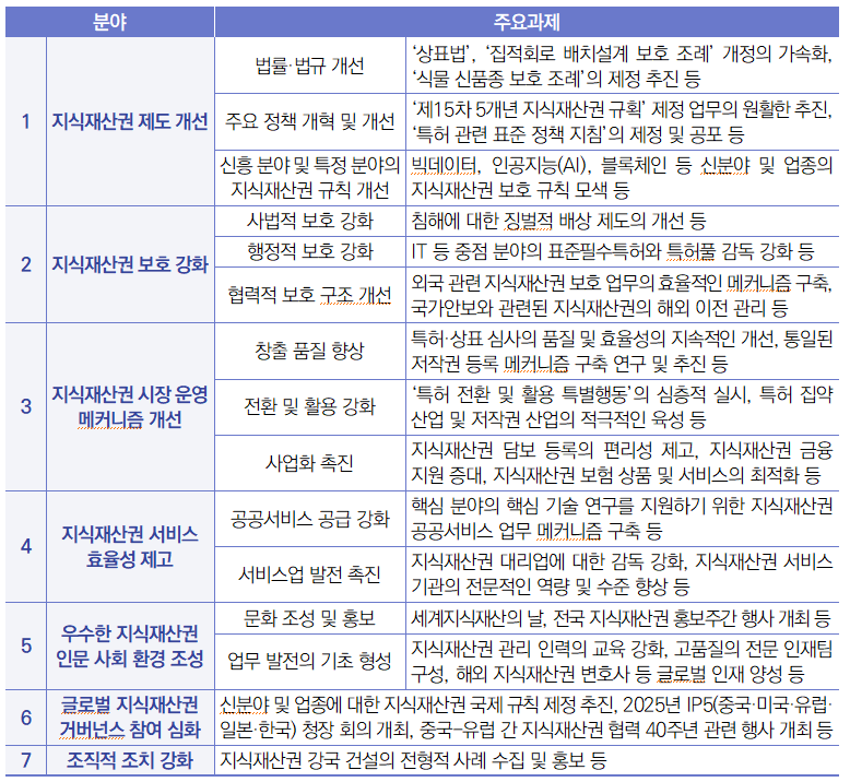 - (주요내용 )동 계획은 지식재산권 강국 건설을 위한 2025년 7개 분야의 118개 과제를 다음과 같이 제시함 ![]() 1) 国家知识产权强国建设工作部际联席会议办公室. 2) 동 계획의 원문은 다음의 링크 참조: https://www.cnipa.gov.cn/module/download/downfile.jsp?classid=0&showname=2025%E5%B9%B4%E7%9F%A5%E8%AF%86%E4%BA%A7%E6%9D%83%E5%BC%BA%E5%9B%BD%E5%BB%BA%E8%AE%BE%E6%8E%A8%E8%BF%9B%E8%AE%A1%E5%88%92.pdf&filename=505cfd4b42ba4b7c8a0dad7b9324b5a0.pdf |