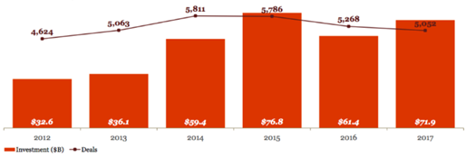 - (주요내용) 동 보고서의 결과에 따르면, 2017년 미국의 벤처 투자를 받은 기업은 17% 증가하였고 벤처 투자 금액은 2016년보다 증가하였으나 벤처 투자 건수는 감소한 것으로 나타났으며, 주요내용은 다음과 같음 ∙ (전체규모) 벤처 캐피탈 투자 금액은 2017년에 약 719억 달러를 기록하여 2015년에 768억 달러에 이어 역대 두 번째로 많은 금액을 투자하였으나, 거래 건수는 2017년 5,052건을 기록하여 2012년 4,624건 이후 최저치를 기록함
