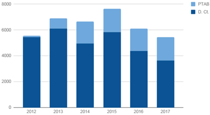 - (배경) 2017년 7월 2일, Unified Patent社는 ‘2017년 상반기 특허 분쟁 보고서(1st Half 2017: Patent Dispute Report)’를 발표한 바 있음2) ∙ 상반기의 특허 분쟁 건수는 2,901건을 기록하여 전년도 상반기(3,009건) 대비 4%p 감소하였으며, 지방법원의 특허 소송 건수는 1914건으로 전년도 상반기(2,183건) 대비 12%p 감소하였으나, 미국 특허심판원(PTAB)에 접수된 특허무효심판은 987건으로 전년도 상반기(826건) 대비 16%p 증가함 - (주요내용) Unified Patent社는 2017년 특허 분쟁 건수를 조사한 최종 결과를 발표하였으며, 2017년 제기된 특허 분쟁 건수는 약 5,455건을 기록하여, 2016년 6,114건보다 감소한 것으로 나타남 ∙ 지방법원의 특허 소송 건수는 3,649건으로 전년도 대비 17%p 감소하였으나, PTAB에 접수된 특허무효심판은 1,796건으로 전년도 대비 3%p 증가함