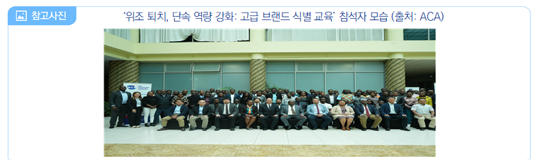 ∙ 2025년 5월 14일, 케냐 위조방지당국(Anti Counterfeit Authority, ACA)은 ‘위조 퇴치, 단속 역량 강화: 고급 브랜드 식별 교육(Fighting Fakes, Empowering Officers: High-Level Brand ID Training)’을 실시함