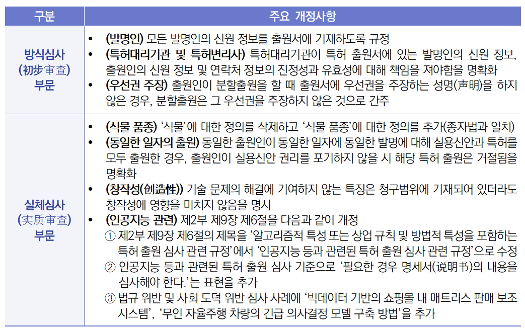 - (개요) CNIPA는 2025년 6월 15일까지 이메일(zhinan@cnipa.gov.cn)을 통해 사회 각계로부터 특허심사지침의 개정 및 개선에 대한 구체적인 의견을 접수할 예정임 - (주요내용) 특허심사지침 개정 초안(의견수렴안)의 추진 배경 및 주요 개정사항은 다음과 같음 (1) 배경 ∙ CNIPA는 혁신 주체의 특허 심사 및 권리 확정 업무에 대한 합리성 요구에 적극적으로 추응답하고 특허 심사 품질과 심사 효율성을 지속적으로 향상시키기 위해 2025년 1월 특허심사지침의 개정 작업을 시작함 ∙ 이번 특허심사지침 개정은 국가 수요를 반영하고 사용자 만족도를 충족하는 것을 목표로 새로운 분야 및 업종에 대한 특허심사 기준을 완비하는데 중점을 두고 심사 실무에서 시급하게 해결해야 할 사항 등을 대상으로 진행됨 (2) 주요 개정사항