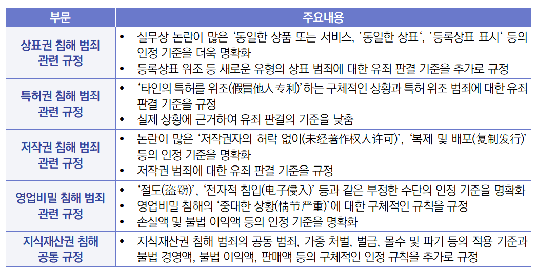 (关于办理侵犯知识产权刑事案件适用法律若干问题的解释)’을 발표함 - (주요내용) 동 해석을 제정하게 된 배경과 부문별 주요내용은 다음과 같음 (1) 제정 배경 ∙ 전국 인민법원과 인민검찰원은 재판 및 검찰 기능을 충분히 발휘하여 2013년부터 2024년까지 지식재산권 침해 형사사건을 6만 9,100건 기소하고, 6만 4,600건 1심 종결함 ∙ 하지만 지식재산권 침해는 여전히 발생하기 쉽고, 범죄 행위가 신형화·복잡화·고도화 등의 특징을 보이면서, 사회 각계의 혁신·창작 주체들은 지식재산권의 형사 보호를 강화하려는 요구가 점점 더 강해지고 있음 ∙ 특히 2021년 ‘형법 개정안(11)(刑法修正案(十一))’이 지식재산권 침해 범죄 행위의 유형을 확대하고 유죄 기준을 보완하며 새로운 죄명을 추가함에 따라 관련 사법해석을 시급히 마련해야 할 필요성이 있음 (2) 부문별 주요내용 ∙ 동 해석은 총 31개 조항으로 구성되어 있으며, 각 조항은 5개 부문으로 구분됨 ![]() 1) 중국의 사법해석은 사법기관이 법률을 적용하는 과정에서 구체적으로 법률을 운용하는 문제에 관한 해석을 의미하며, 사법해석을 제정하는 주체는 최고인민법원과 최고인민검찰원임. 사법해석은 법률적 효력을 가지나, 법률·법규와 저촉될 수 없고, 법률·법규와 충돌될 때는 법률·법규를 적용하여야 함(출처: 전대규, 중국의 사법해석에 관한 연구). |