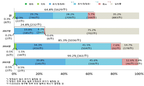 - (개요) JPO는 2015년 4월부터 특허이의신청제도를 도입하고, 동년 10월부터 신청이 본격화된 이후, 현재까지 총 2,512건의 이의신청이 제기되었고, 그중 1,629건이 최종처분됨(2017년 9월 말 기준) ∙ JPO는 특허이의신청 건수 등을 분석한 결과 이의신청서 등의 미비가 많이 발생하여, 이번에 특허이의신청 현황과 함께 절차상의 유의점에 대하여 공개함 - (주요내용) 특허이의신청 현황 및 절차상 유의점을 요약하면 이하와 같음 (1) 특허이의신청 처리현황(2017년 9월 기준) ∙ 2015년에 제기된 사건은 약 99.2%, 2016년에 제기된 사건은 약 85.3%, 2018년에 제기된 사건은 약 24.8%가 최종적으로 처분되었으며, 전체적으로 2017년 9월까지 제기된 사건 중 약 64.8%가 최종적으로 처분되었음