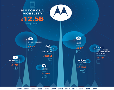 - (주요내용) Google社는 지난 10년간 지식재산권 획득 및 사업 확장을 위해 약 200건의 M&A 거래를 했으며, 주요 M&A 대상 기업은 다음과 같음 ∙ (Motorola Mobility) 2012년 Motorola社를 125억 달러에 인수함 ∙ (Nest Labs) 2014년 Nest Labs社를 32억 달러에 인수하여 사물인터넷(IoT) 사업에 진입함 ∙ (DoubleClick) 2007년 마케팅 솔루션 제공업체인 DoubleClick社를 3.1억 달러에 인수함 ∙ (YouTube) 2006년 비디오플랫폼인 YouTube社를 17억 달러에 인수함 ∙ (Waze) 2013년 검색 앱인 Waze社를 11.5억 달러에 인수함 ∙ (HTC) 2017년 HTC社의 픽셀 스마트폰 부문을 11억 달러에 인수함 ∙ (AdMob) 2009년 모바일 광고 회사인 AdMob社를 7.5억 달러에 인수함 ∙ (DeepMind) 2014년 DeepMind社를 6.5억 달러에 인수하면서 인공지능(AI)에 높은 관심을 보임