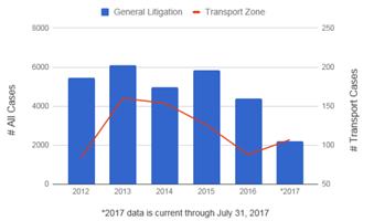 ∙ 2017년에 운송 분야 소송 중 안전 기술 관련 소송을 제외한 모든 기술 관련 소송이 이미 2016년 제기된 소송 건수와 같거나 그 이상으로 나타남