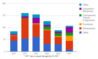 - (주요내용) 2016년도의 감소 추세를 벗어나 2017년에는 운송 분야의 특허 소송이 증가함 ∙ 운송 분야의 소송은 2012년부터 2016년까지 전반적인 특허 소송의 추세와 비슷하며, 2013년을 정점으로 이후로 점차 감소함 ∙ 그러나 자동차에 사용되는 전자제품 및 인포테인먼트 시스템(infotainment system)을 대상으로 한 소송의 증가로 인해 2017년 운송 분야 소송은 이미 2016년 소송건수를 초과함
