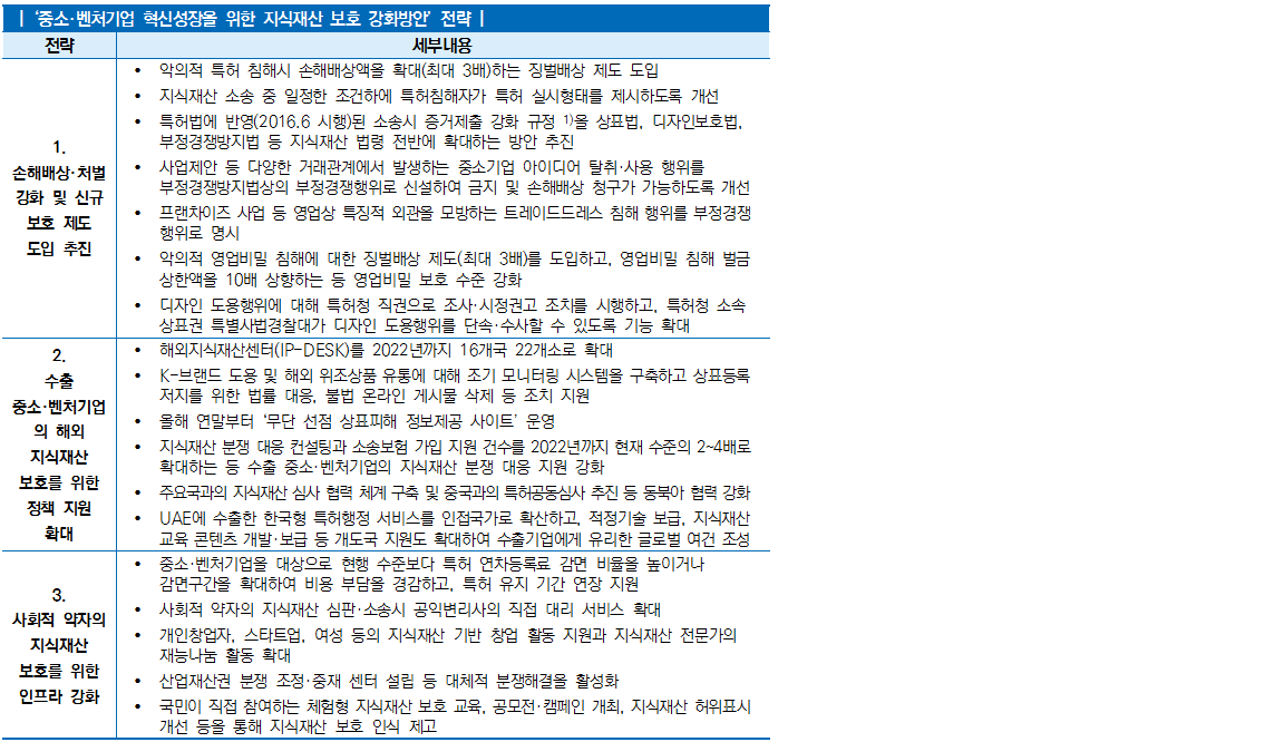 - (배경) 우리나라의 경우, 특허침해에 대한 손해배상액이 미국의 1/6에 불과하고 하도급 관계가 아닌 경우 하도급법상 기술자료 제공 요구·유용 금지 규정이 적용이 되지 않는 등 지식재산에 대한 보호 수준이 낮아 중소·벤처기업의 기술혁신과 성장을 저해하는 문제가 존재함 - (주요내용) 특허청은 이번 방안 수립을 통해서 ‘중소·벤처기업의 기술혁신과 성장을 통한 4차 산업혁명 주도’라는 정책 비전을 실현하기 위하여 다음과 같은 3가지 전략을 추진함 ∙ 중소·벤처기업의 특허, 아이디어, 기술 및 영업비밀 보호 강화를 위한 손해배상·처벌 강화와 새로운 보호 제도 도입 추진 ∙ 수출 중소·벤처기업의 해외 지식재산 보호를 위한 정책 지원 확대 ∙ 중소기업, 학생 등 사회적 약자의 지식재산 보호를 위한 인프라 강화 ![]() 1) 침해입증을 위해 반드시 필요한 경우 영업비밀이라도 제출의무 부과함. |