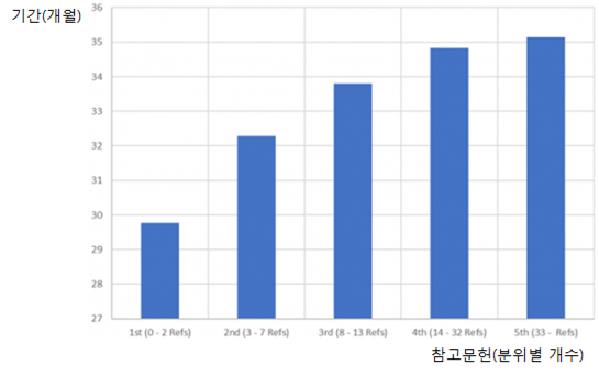 - (배경) 2017년 등록된 특허의 출원인이 평균(average) 44개의 참고문헌을 인용하여 특허심사관이 참고할 수 있게 하고 있으나, 등록된 특허의 출원인이 인용한 참고문헌의 중앙값(median)은 10개 밖에 안 됨 ∙ 평균값과 중앙값 사이의 차이는 데이터의 왜곡의 결과이며, 이것은 소수의 특허가 불필요하게 많은 수의 참고문헌을 인용하고 있기 때문임1) - (주요내용) 2017년 등록된 특허를 대상으로 5분위로 그룹화 하여 특허에 인용된 참고문헌의 통계를 조사한 결과를 발표함 ∙ 각 분위마다 등록된 특허에 대한 평균 심사 계류기간(개월)을 조사하였으며, 참고문헌 개수가 더 많은 특허는 더 긴 계류기간과 인과관계가 있는 것으로 나타남