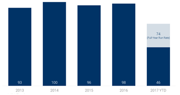 - (주요내용) CB insight社는 자사의 데이터를 사용하여 시가 총액 기준으로 미국 상위 10대 기술 기업1)의 M&A 활동을 분석했으며(2017년 8월 15일 기준), 주요내용은 다음과 같음 ∙ 기술을 보유한 대기업들은 몇 년 전만 해도 빠른 속도로 사업을 확장하고 있었으나, 최근 Microsoft社, Apple社, Facebook社 등 기술을 보유한 대기업들의 M&A가 지연되고 있어 2017년에는 오히려 감소할 것으로 전망됨 ∙ 2017년 8월까지 기술을 보유한 대기업들은 46건의 M&A를 성사하였으며, 현재의 비율로 계산하면 연말까지 약 74건 M&A가 진행될 것으로 예상되어 작년보다 약 25% 감소할 것으로 전망됨