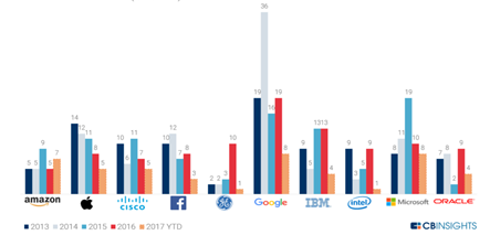 • 2017년 8월 16일, 미국 시장조사기관인 CB insight社는 Apple社 등 기술을 보유한 대기업들의 M&A 활동을 조사하여 발표함