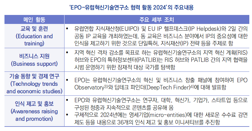 - (배경 및 개요) 유럽혁신기술연구소는 2008년 유럽연합(EU)이 기업가 정신을 장려하고 비즈니스, 교육, 연구를 통합하여 유럽 전역의 혁신을 촉진하기 위해 설립한 독립 기관으로, 신생 기업의 초기 및 성장 단계에 대한 지원을 제공함2) ∙ EPO와 유럽혁신기술연구소는 2022년 양해각서(MOU)를 통해 협력 강화를 위한 프레임워크를 구축하여 유럽 전역의 혁신가와 기업가가 아이디어를 제품 및 서비스로 전환할 수 있도록 지원하고 유럽 기업의 이익을 더욱 잘 보호하기 위한 구체적인 활동과 프로젝트를 개발 및 실행해 옴 - (주요내용) 2024년 EPO와 유럽혁신기술연구소는 총 4개의 메인 활동(① 교육 및 훈련, ② 비즈니스 지원, ③ 기술 동향 및 경제 연구, ④ 인식 제고 및 홍보)과 98개의 세부 조치 수행에 협력함 ![]() 1) 동 자료표의 원문은 다음의 링크 참조: https://link.epo.org/web/news/2025/en-eit-epo-factsheet-2024.pdf 2) 관련 내용은 연구원 IP News 제2025-15권호 참조: h ttps://www.kiip.re.kr/board/trend/view.do?bd_gb=trend&bd_cd=1&bd_item=0&po_item_gb=EU&po_no=23550