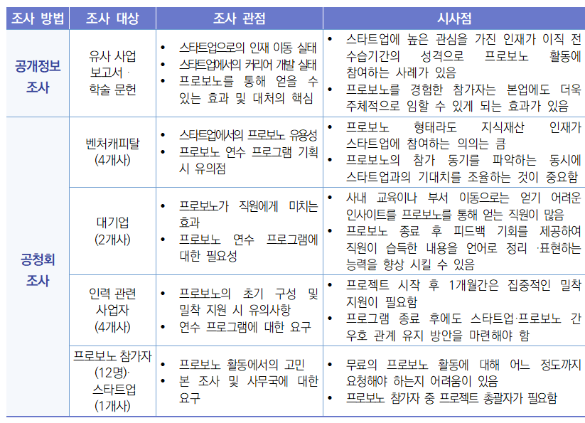 - (주요내용) 동 보고서는 스타트업의 과제 해결을 위한 프로보노 팀에 관한 연구를 진행하고 이에 대한 결과와 시사점을 제시함 (1) 연구 개요 ∙ (연구 주제) 스타트업에서 프로보노 활동 수행의 의의와 핵심 요점의 정리 ∙ (연구 목표) ① 대기업과 스타트업 간 지식 유동화(ナレッジ流動化)를 통한 양측의 사업 성장, ② 지식 유동화를 통해 지식을 보유한 개인, 지식 유동화를 촉진하는 지원자에게도 혜택이 돌아가는 것 (2) 연구 수행 결과 ![]() 1) 프로보노(Pro bono)는 라틴어 'Pro bono publico(공익을 위해)'에서 유래한 단어로, 전문적인 기술과 경험을 활용한 사회공헌 활동을 의미하며, 동 연구에서는 ‘업무시간 외’, ‘금전적 보상 없이’ 지식재산 관련 전문 지식을 활용한 프로보노 활동에 초점을 맞춤(출처: JPO). |